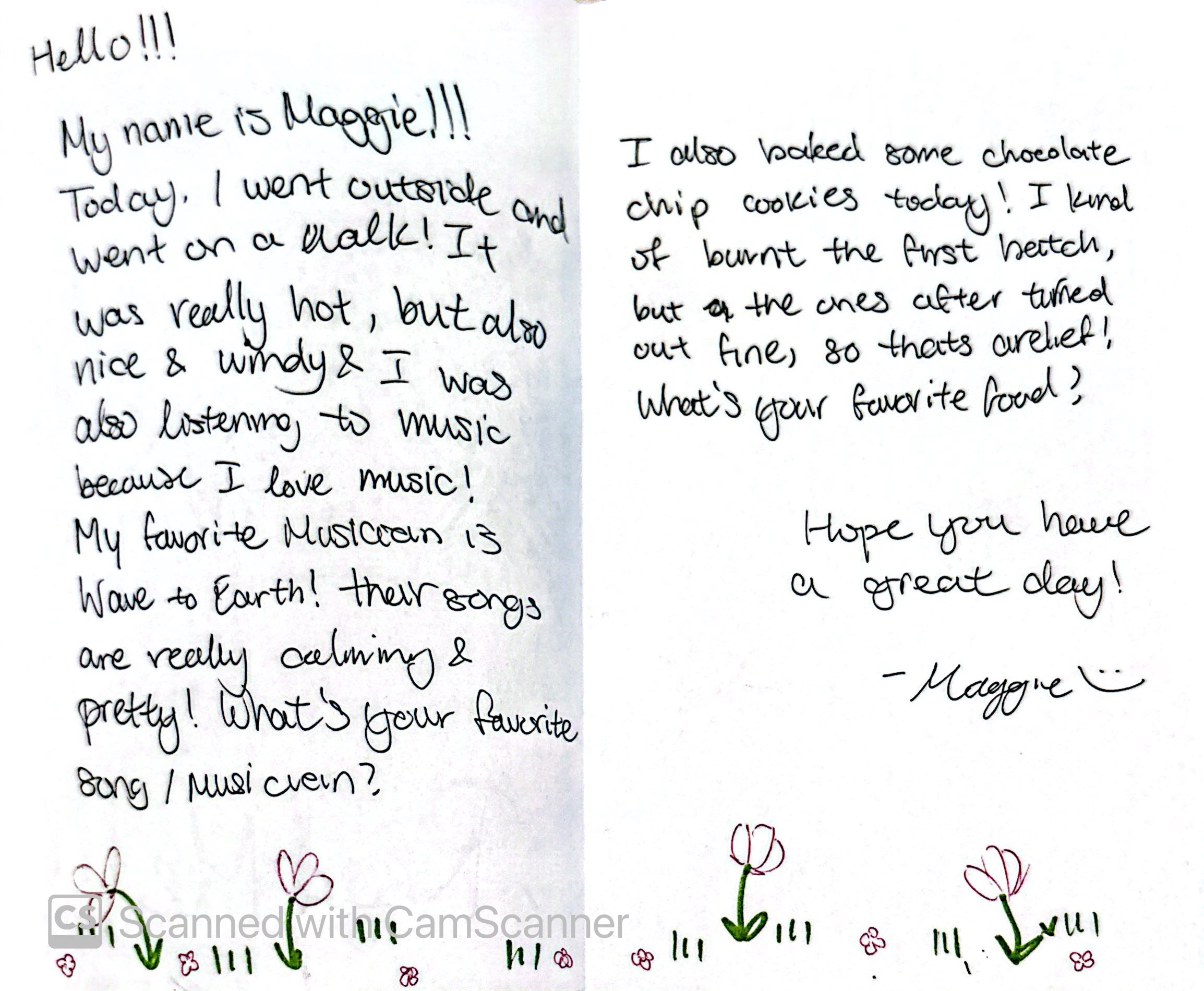 Letter Guidelines: Write a letter (6-10 sentences) about: something you did recently, a hobby you enjoy, a favorite place or season, something that made you smile, etc. The letter must fill up the inside of the card. Please do not mention illness, politics, hospitals or write phrases like “get well soon.” Instead, focus on sharing something cheerful about your life. Each completed card counts as 1 SSL hour. Please start with a friendly greeting such as: Hi there! Hello! Please only include your first name at the end of the letter (Ex. Love, Alex). Letters should be handwritten so they feel more personal and genuine to the recipient.
