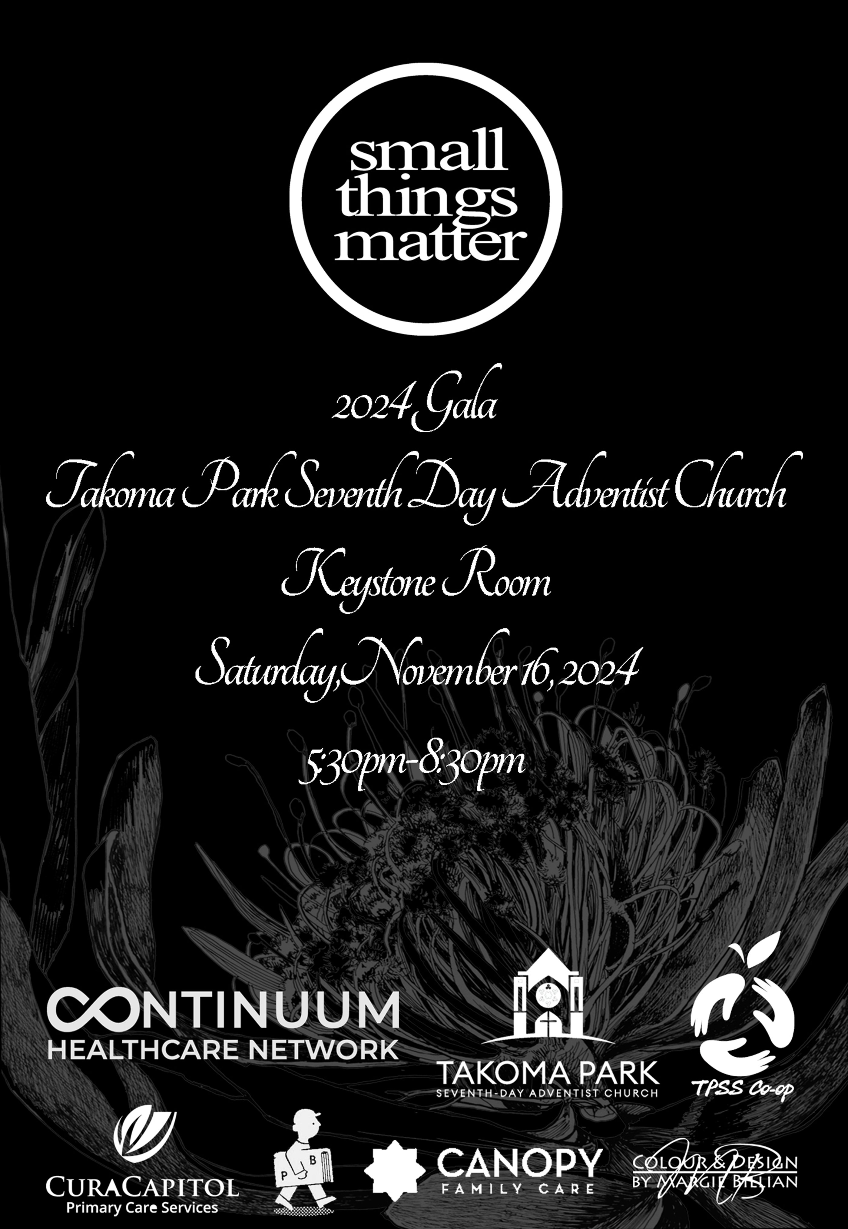 Small Things Matter is looking for volunteers to help at our upcoming gala on Saturday November 16 at the Takoma Park Seventh Day Adventist Church, 6810 Eastern Ave NW, Washington, DC 20012 from 7pm-9pm to benefit the 8000 food insecure individuals we serve in Montgomery County.